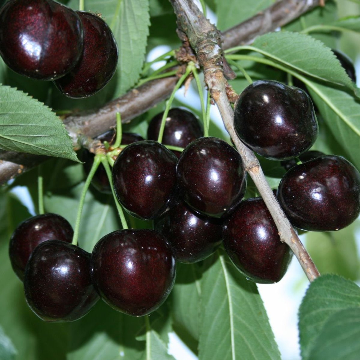 Fruit:Fruits: large sized, heart-shaped, bright dark red to black skin background colour and spotted skin overcolour. Firm, crunchy, red coloured flesh with good flavour. Average resistance to handling and poor sensitivity to fruit Monilia;
